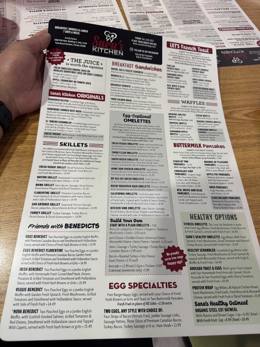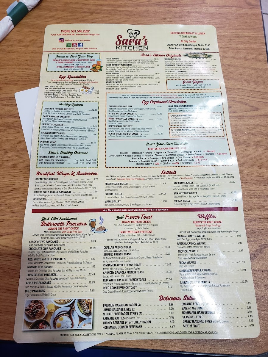 Welcome to Sara's Kitchen, a cozy culinary haven nestled at 2000 PGA Blvd, Palm Beach Gardens, FL. Known for its delightful menu and welcoming atmosphere, this charming spot is a true local gem. As you step inside, the energetic ambiance and quirky, diner-inspired decor greet you, instantly setting the stage for a memorable dining experience.