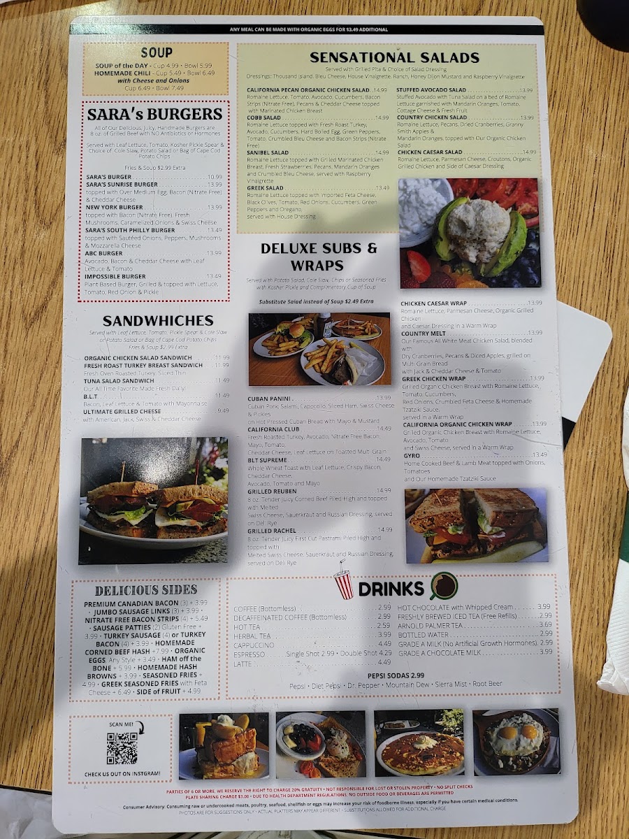 “ Sara's is a cozy eatery in a convenient location and ample parking. We were greeted by a happy young lady who took our drink order. She made a prompt delivery of water and fresh squeezed orange juice and took our breakfast orders. Pancakes were dinner plate sized and delicious. The Boston Skillet did not disappoint either. The fresh ground corned beef hash was 5 star. From the service, food and variety of country music (Dottie West 'I was raised on Country Sunshine, Darius Rucker, Eric Church..etc) this is a great place to enjoy breakfast. ”